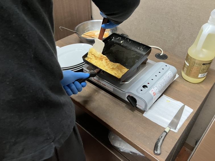 さらさ湯沢の朝食です。だし巻き卵は出汁がしっかり効いていて美味しい。青梗菜の煮浸しはさっぱりしており、朝食にはちょうどいいとお話ありました。