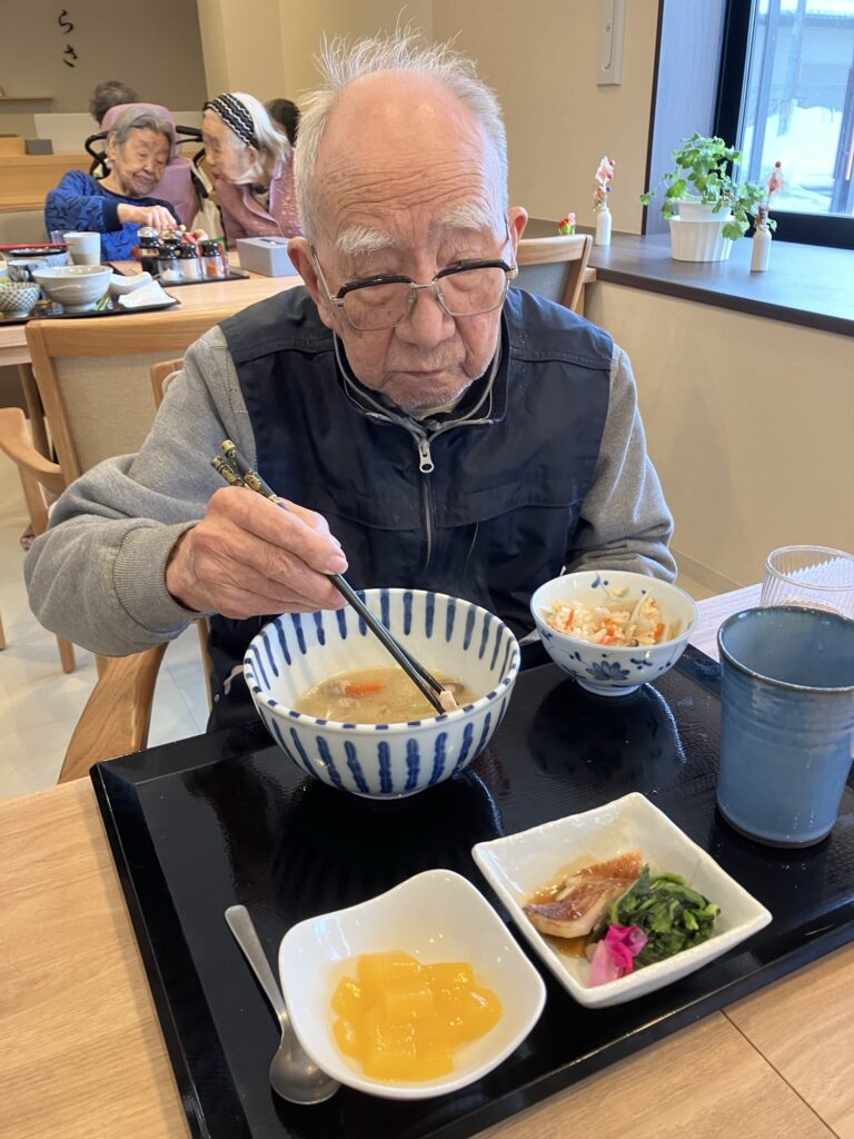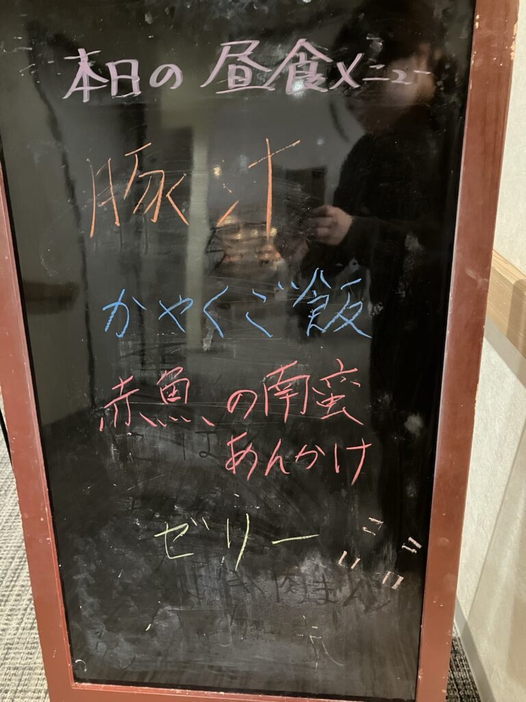 さらさ秋田土崎の昼食です。今日は、豚汁です。大きな鍋で煮込んでいて、具が沢山入っていてダシが出ています。熱々で提供されるのが良いですね。